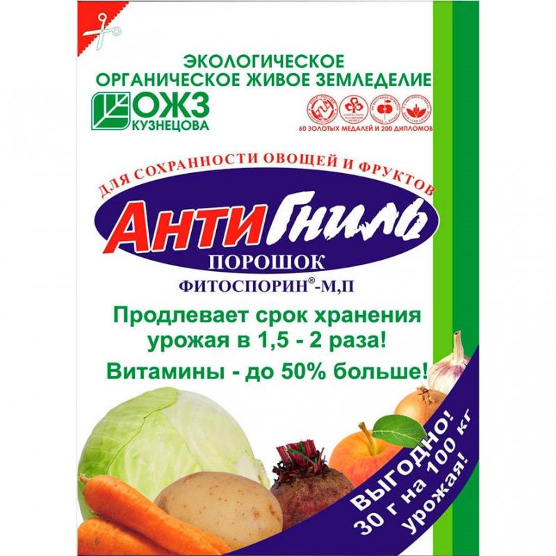 АнтиГниль–природный биофунгицид для защиты овощей, ягод и фруктов от гнилей при хранении и транспортировке. Продлевает срок хранения продуктов в 1,5–2 раза. Готовым рабочим раствором при помощи удобного распылителя или опудриванием порошком можно сразу, не тратя времени на разведение, обработать урожай и место хранения (погреб, ящик и т.д.). АнтиГниль не содержит химических добавок, безопасен для человека (нет срока ожидания), вы можете употреблять в пищу овощи и фрукты даже в день обработки.