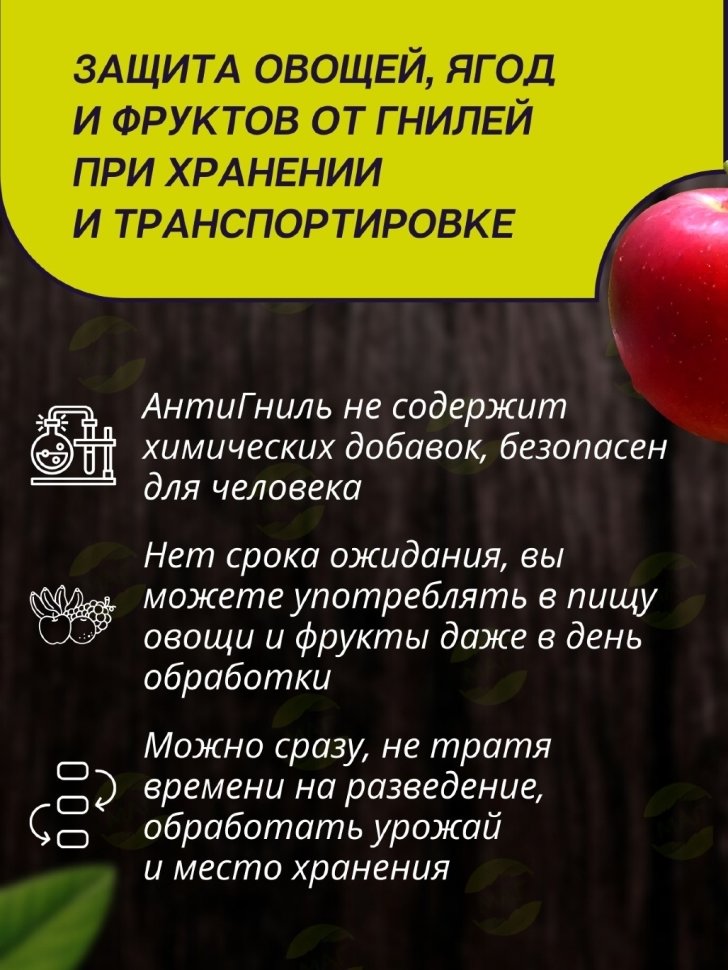 Назначение: АнтиГниль – природный биофунгицид на основе бактерий для защиты овощей, ягод и фруктов от гнилей при хранении и транспортировке. Продлевает срок хранения продуктов в 1,5–2 раза.