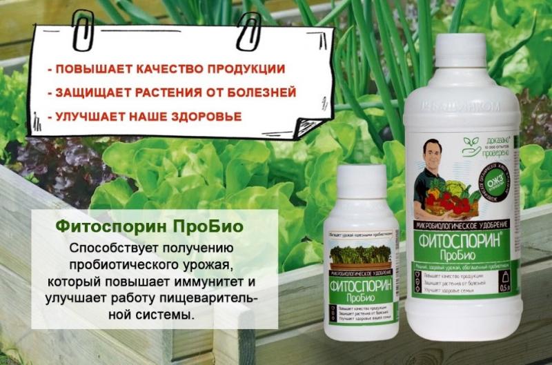 Фитоспорин ПроБио – это: прекрасные экологически чистые овощи, зелень; чудесные, оздоравливающие людей пробиотики; сытая и здоровая микрофлора кишечника, накормленная пребиотиками (зелень, овощи, ягоды – являются отличной пищей для полезных микроорганизмов микробиома человека); высокий урожай с повышенным содержанием жизненно важных микроэлементов, витаминов и ферментов. защита от болезней: 400 г таких овощей и 200 г ягод и фруктов, выращенных с Фитоспорином ПроБио, в 2 раза снизят риск любых смертельных заболеваний (сердечно-сосудистых, желудочно-кишечных, диабета, онкологии…). Фитоспорин ПроБио надо использовать и летом в огороде, и зимой (микрозелень, зелень, овощи на подоконнике, в квартире под фитосветильником).