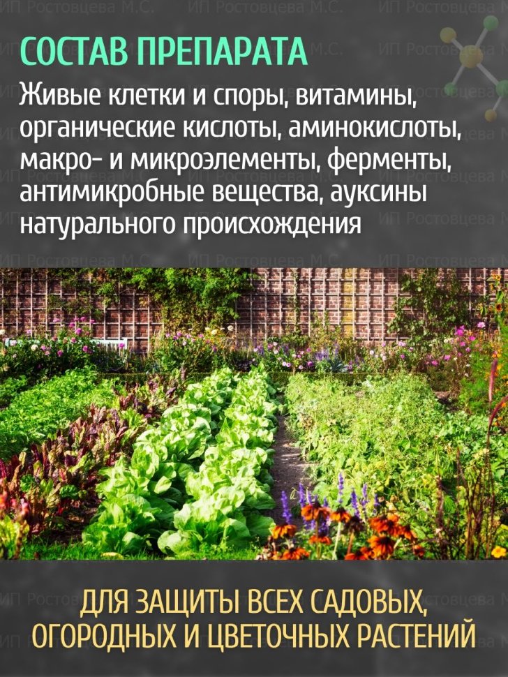 Состав препарата: Живые клетки и споры Bacillus subtilis штамм 3Н, титр не менее 1х108/мл, витамины, органические кислоты, аминокислоты, макро- и микроэлементы, ферменты, антимикробные вещества, ауксины натурального происхождения. Защищаемые культуры: Все садовые, огородные и цветочные растения.