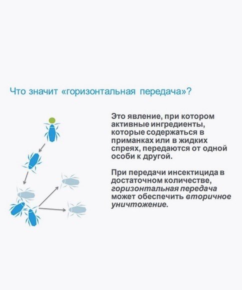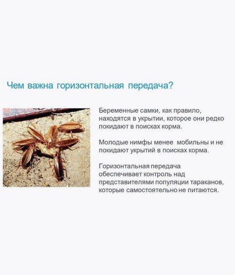 Высокая вкусовая привлекательность для тараканов. Инновационный механизм действия с эффектом биоактивации в организме вредителя. «Горизонтальное перенесение» обеспечивает вторичное (до 76 %) и третичное (до 81 %) уничтожение тараканов. Эффективная борьба с невосприимчивыми (отвращение к гелевым приманкам) и резистентными популяциями тараканов. Позитивный экологический профиль, безопасный для нецелевых объектов.