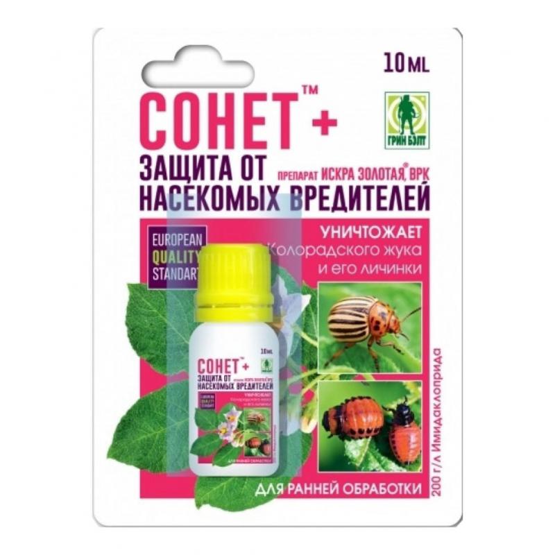 СОНЕТ — это серия высокоэффективных препаратов от колорадского жука и личинок. Характеризуется: надежной защитой при высоких температурах. Достаточно одной обработки в сезон.