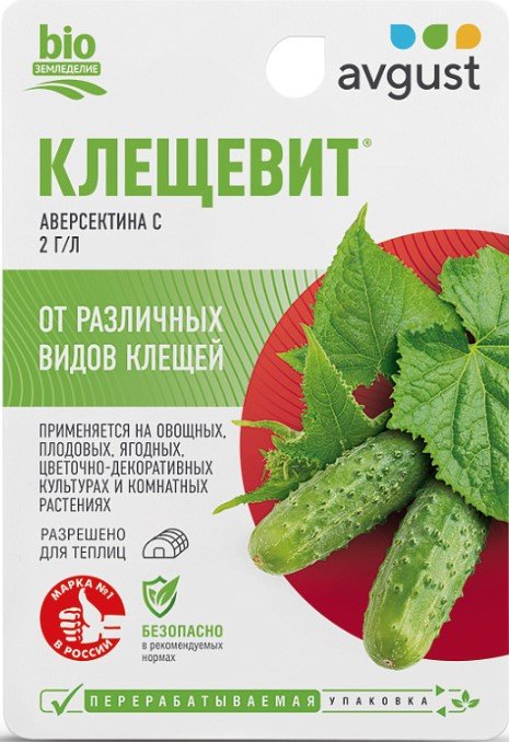 Биологический препарат для борьбы с клещами на различных культурах. Применяется в любую фазу развития растений, по мере появления вредителей. Клещи прекращают питание через 6-8 часов, а их полная гибель наступает через 3-4 дня. Имеет минимальный срок ожидания – плоды можно употреблять в пищу уже через 3 дня после обработки. Не вызывает привыкания у вредителей.
