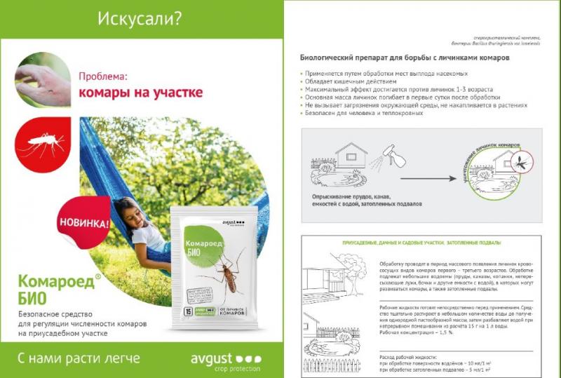 Биологический препарат для сокращения численности комаров на участке. Действует на все стадии личинок комаров. Безопасен для человека и теплокровных. Не загрязняет окружающую среду. Не накапливается в растениях.
