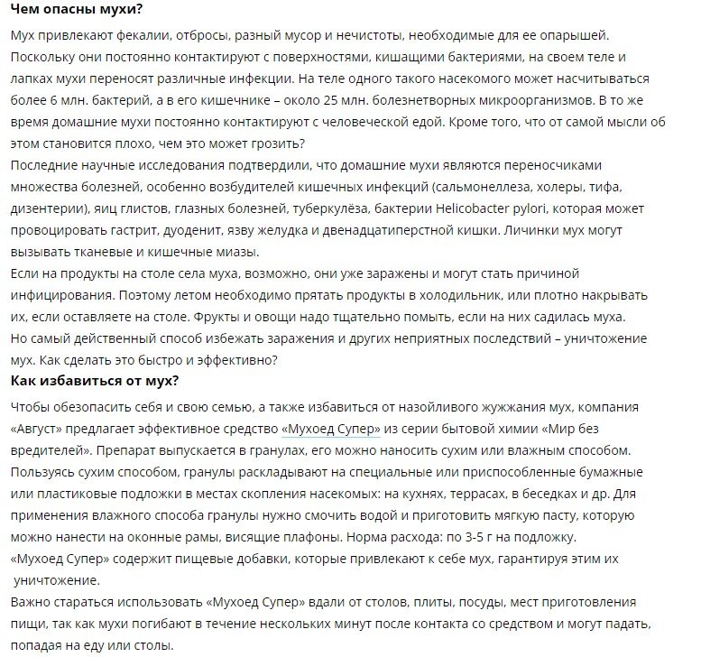 От всех видов мух. Применяется для уничтожения мух в помещениях, таких как летние кухни, терассы, беседки и др., а также на фермах. Насекомые погибают в течение нескольких минут после контакта со средством. Содержит пищевые добавки, привлекающие насекомых. Можно использовать в виде пасты для обработки оконных рам и плафонов.