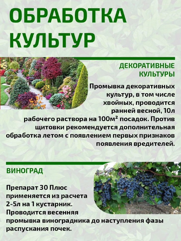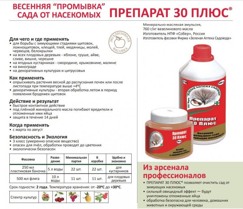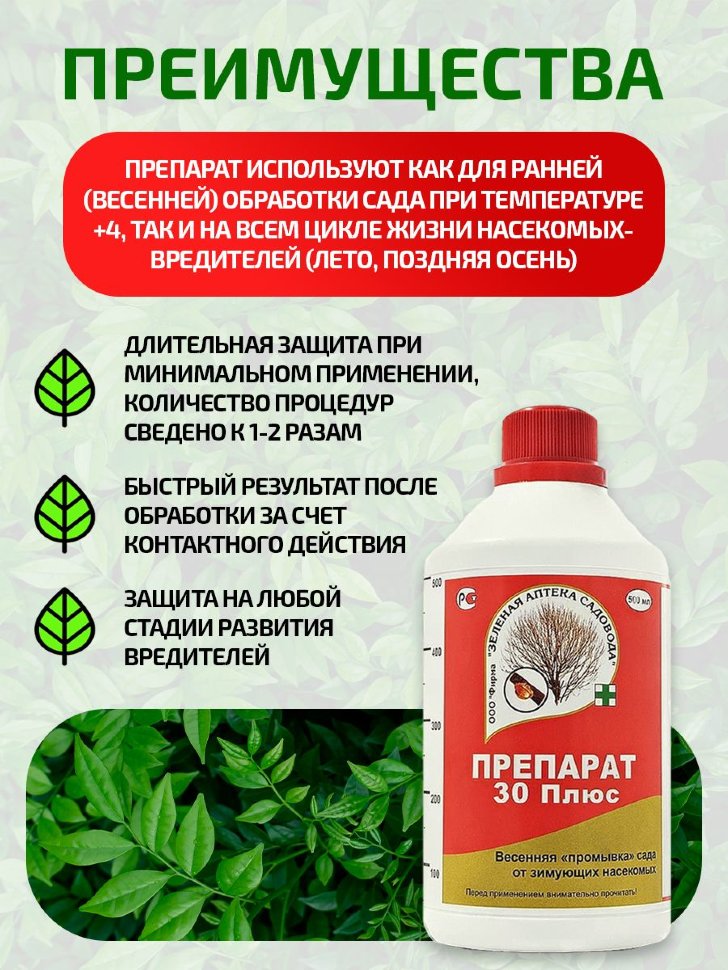 ПРЕПАРАТ 30 ПЛЮС позволяет очистить сад от зимующих насекомых. Сильный овицидный эффект- будут уничтожены отложенные яйца. Обработка безопасна для человека, домашних животных и окружающей среды.