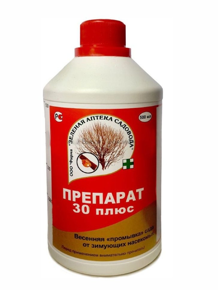 Минерально-масляная эмульсия против зимующих вредителей "Препарат 30 плюс", 500 мл. ПРЕПАРАТ 30 ПЛЮС позволяет очистить сад от зимующих насекомых. Сильный овицидный эффект- будут уничтожены отложенные яйца. Обработка безопасна для человека, домашних животных и окружающей среды. Действие и результат: быстрое контактно действие; под пленкой минерального масла погибают вредители и отложенные ими яйца; защита в течение до 14 дней. Для чего и где применять: для борьбы с зимующими стадиями щитовок, ложнощитовок, клещей, тлей, медяницы, молей, червецов, белокрылки. На всех плодовых деревьях: яблоне, груше, айве, сливе, вишне, черешне. На ягодных кустарниках: смородине, крыжовнике, малине. На винограде. На цитрусовых культурах. На декоративных кустарниках.