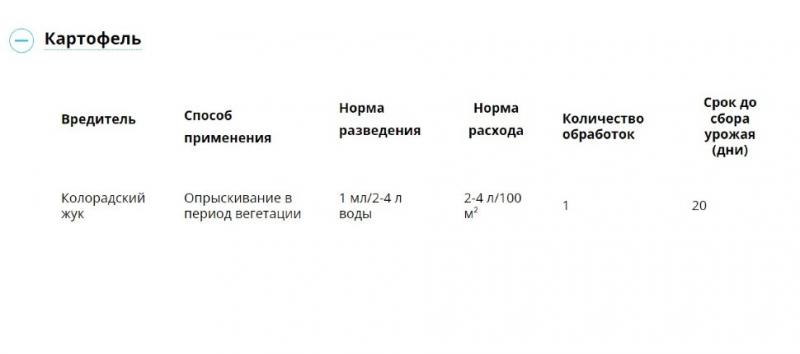 Проверенный временем препарат для борьбы с личинками и взрослыми особями колорадского жука. Обладает системным механизмом действия. Действует на взрослых жуков и личинок разных возрастов. При выпадении осадков не смывается с растения, сохраняя полную защиту всех его частей. Защищает культуру длительное время, поэтому можно ограничиться единичной обработкой посадки. Эффективно действует при широком диапазоне температур.  Действующее вещество: 200 г/л имидаклоприда. Препаративная форма: ВРК - водорастворимый концентрат.