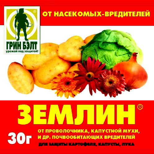 Препарат на основе диазинона, ближайший родственник Медветокса (хим. аналог). Землин поражает почвенных паразитов контакто-кишечным путем, сохраняя токсическую активность до 60 дней. Используется преимущественно в период посадки семян и клубневых культур, а также осенью, после сбора урожая (профилактическое внесение).