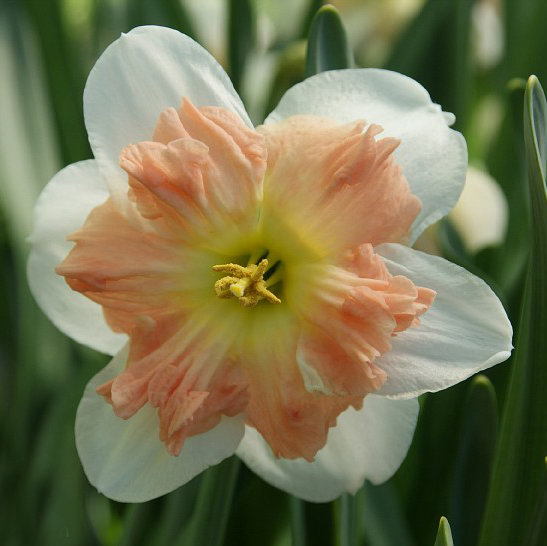 Белый, коронка с сильно-гофрированным краем цвета фламинго, один из лучших сортов крупнокорончатых/сплиткорончатых нарциссов.