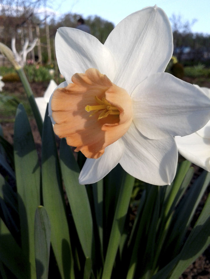 Цветок одиночный, диаметром 9-10 см. Окрас белый с розовой коронкой. К почве нетребователен при условии, что она хорошо дренирована. Расположение для посадки - солнечные места или полутень.