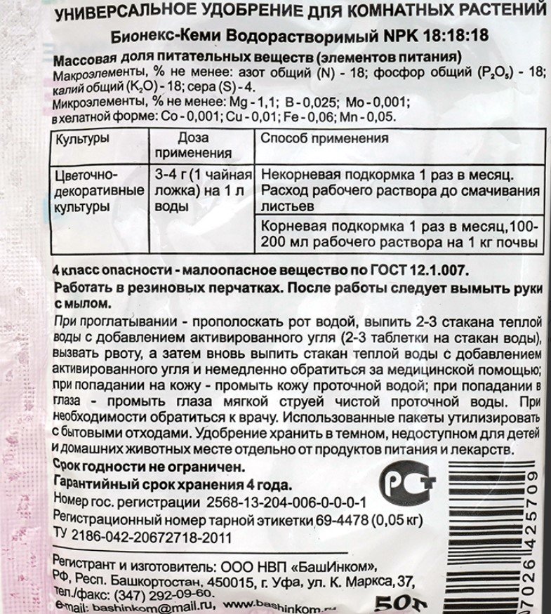 Обеспечивает комнатные растения основными элементами питания, защищает от хлорозов, повышает их декоративность, усиливает иммунитет. Препаративная форма: Порошок. Товарная форма и упаковка: Пакет. Состав препарата Содержит азот – 18%, фосфор – 18%, калий – 18%, сера – 4%, магний – 1,1%; микроэлементы: бор – 250 мг/кг, молибден – 10 мг/кг, кобальт – 10 мг/кг, медь – 100 мг/кг, железо – 600 мг/кг и марганец – 500 мг/кг. Удобрение перед применением растворить в воде в количестве 3-4 г (1 ч.л.) на 1 л. Применять в качестве внекорневой и корневой подкормки 1 раз в месяц. 50 г на 17 л воды для полива до 170 кг почвы.