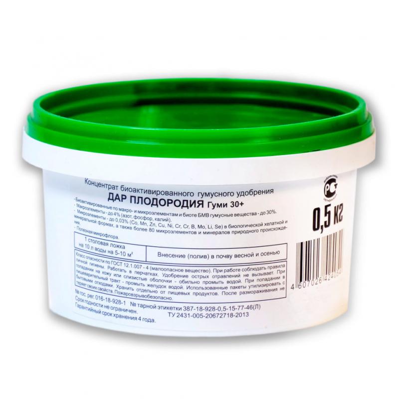 Восстанавливает плодородие почвы практически до целинного плодородия, оздоравливает и оживляет полезную микрофлору почвы, количество почвенной микрофлоры увеличивается в 5–10 раз, ликвидирует усталость почвы, увеличивает содержание активного, самого плодородного гумуса, экономит на 25–30% удобрения. Преимущества: Повышает эффективность усвоения растениями питательных веществ, убирает физиологическую депрессию, вялость роста, повышает качество продукции, улучшает вкус и аромат, увеличивает содержание витаминов, сахаров, микроэлементов и других полезных веществ, связывает, нейтрализует тяжелые металлы, радионуклиды и другие вредные вещества, повышает экологическую чистоту продукции и устойчивость растений к болезням, вредителям, засухе, переохлаждению и другим стрессам, улучшает в 1,5–2 раза сохранность продукции при длительном хранении. Препаративная форма: Паста. Товарная форма и упаковка: Ведро. Состав препарата: ГУМИ–30 до 30%; Фитоспорин–М до 1%; микроэлементы в биологической хелатной форме: Co – 0,0003%, Mn – 0,01%, Zn – 0,003%, Cu – 0,003%, Ni – 0,0003%, Cr – 0,0003%, а так же в природной минеральной форме: B – 0,01%, Mo – 0,0003%, Li – 0,0003%, Se – 0,00003%; более 80 микроэлементов и минералов природного происхождения, в т.ч. редкоземельные элементы; макроэлементы: азот – 1%, фосфор – 1%, калий – 2%. Защищаемые культуры: Все садовые, огородные и цветочные растения.