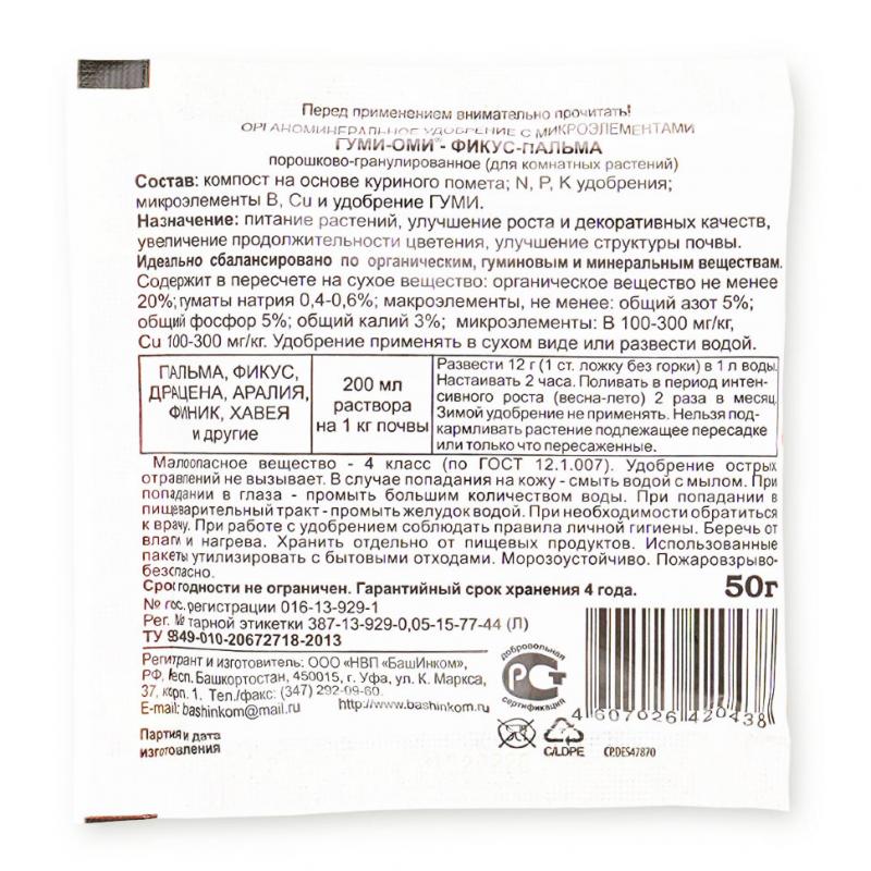 Азот – 7,0%, фосфор – 7,0%, калий – 7,0%; Микроэлементы: бор – 100–300 мг/кг, медь – 100–300 мг/кг; Природный витамин роста Гуми–20 – 0,6%, ферментированное органическое вещество – 20%