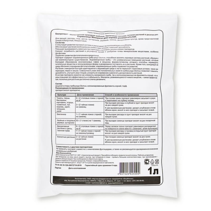 В составе препарата имеются как элементы микоризного гриба, так и колонизированные им фрагменты корней, что в разы повышает его эффективность и стабильность. Микориза, развивающаяся от живого мицелия, – самая эффективная, поскольку для роста ее достаточно слегка увлажнить. Подавляет развитие фитопатогенов и вредителей. Снижает потребность растений в регулярном поливе и удобрении почвы минеральными веществами, особенно фосфатами. Повышает выживаемость саженцев при пересадке, в условиях засухи и низких температур.