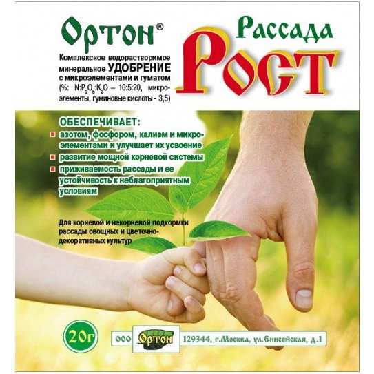 Способ применения: содержимое пакета (20г) растворить в 10л воды. Подкормки проводят 2-3 раза после высадки рассады в грунт путем полива, с последующим интервалом в 7-10 дней. Через 3-4 недели после высадки рассады в грунт наобходимо подкормить растения удобрением "ОРТОН-РОСТ", а для лучшего плодоношения и повышения завязываемости плодов цветущие растения обработать препаратом "Завязь".