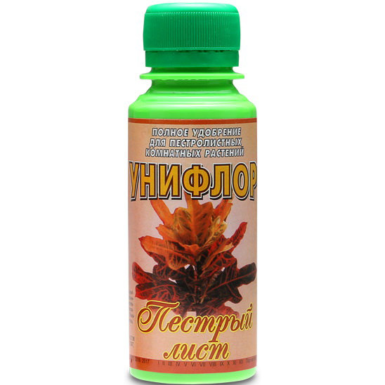 Удобрение Унифлор Пестрый лист - полное удобрение с оптимальным содержанием азота, калия, фосфора, предназначенное для пестролистных комнатных растений и обеспечивающее быстрый и качественный рост декоративной листвы.
