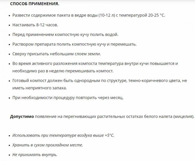 Состав: Бактерии рода Bacillus, молочнокислые бактерии, дрожжи. Создает богатый перегной. Эффективно разлагает растительные остатки. Результат за 30 дней. Рассчитан на 2 м³ растительных остатков.
