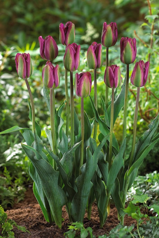 Цветовой контраст зеленой середины и краев лепестков, окрашенных в сиренево-фиолетовый цвет с зелеными продольными полосами тюльпана Nightrider, смотрится очень эффектно и необычно.